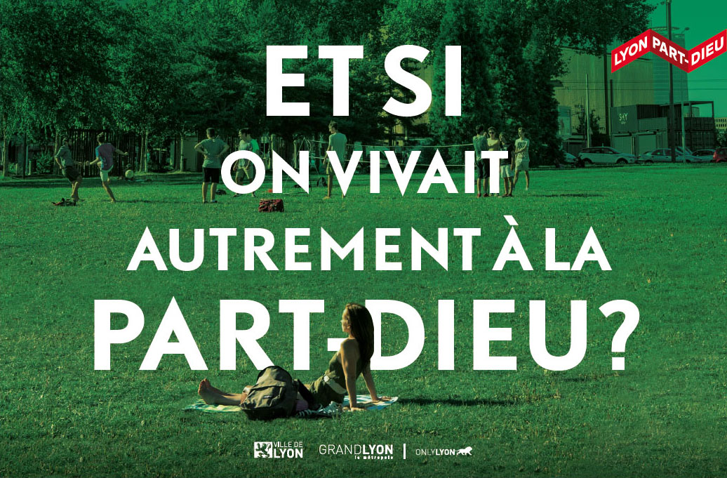 Première campagne de communication positionnant la Part-Dieu comme un territoire à part entière, le dispositif s’adresse au grand public : habitant de la Métropole, du quartier, voyageurs et salariés. Le message propose de percevoir le quartier sous un angle moins habituel, plus sensible et engage à sortir des idées reçues. Le choix de la photo permet d’incarner le message autour d’une réalité déjà vécue. Les photographies, réalisées par la photographe Laurence Danière, donnent à voir une Part-Dieu plus inattendue, moins fonctionnelle qu’elle n’est vécue au quotidien par ses usagers : un bal sur la place Charles de Gaulle, un salarié qui fait son jogging sur la rue Bouchut, une pause ensoleillée dans l’herbe du parc Nelson Mandela. Elles permettent d’incarner un positionnement renouvelé du quartier : tourné vers l’accueil, vers des usages plus diversifiés, où performance économique et qualité de vie se rejoignent.