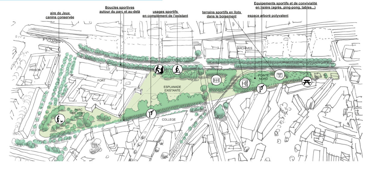 Des îlots sportifs et de convivialité sont aménagés et vinent ponctuer cet espace sous la forme de clairières ou d’îlots.