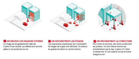 Démolir un bâtiment dans une gare ultra fréquentée, à proximité immédiate des voies ferrées qui empêchent l’utilisation de grues : le défi est de taille. SNCF Gares & Connexions a choisi une démolition en plusieurs étapes, reposant sur une déconstruction à l’aide de vérins disposés aux niveau des 4 poteaux qui soutiennent la structure. Au total, 10 300 tonnes seront ainsi démontées à la fin de l’automne 2018.