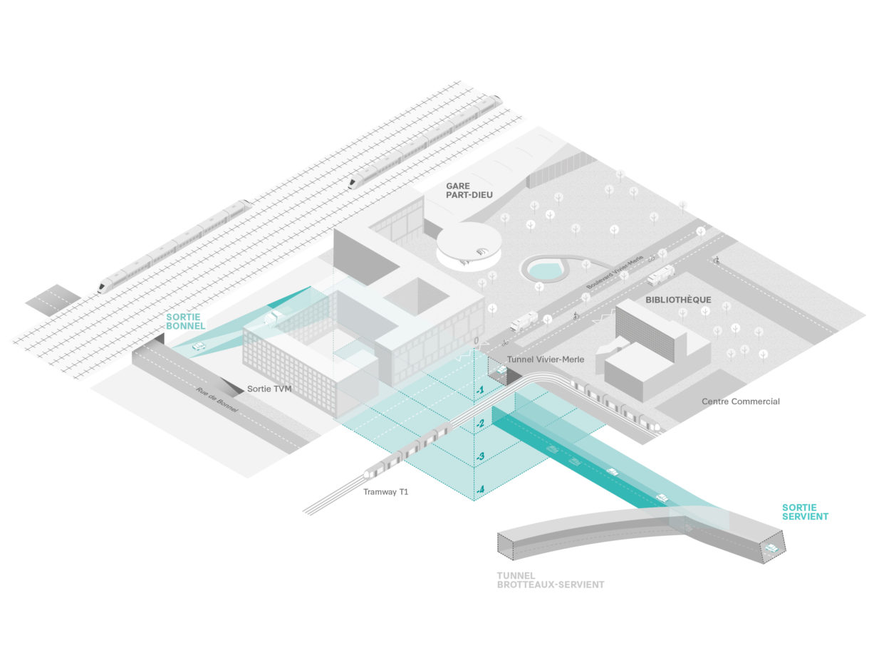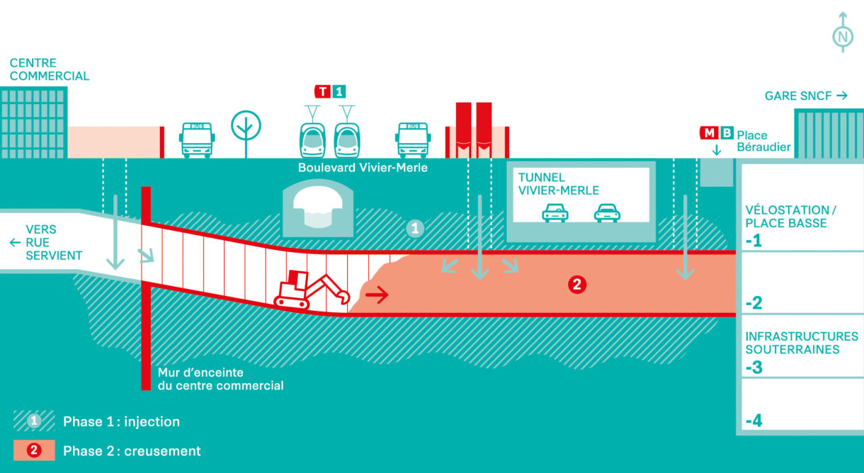 Une fois réalisé, le tunnel de sortie passera sous le tunnel Vivier-Merle, un collecteur d’assainissement majeur et le pôle de transports en commun dont la plateforme ferroviaire du tramway.