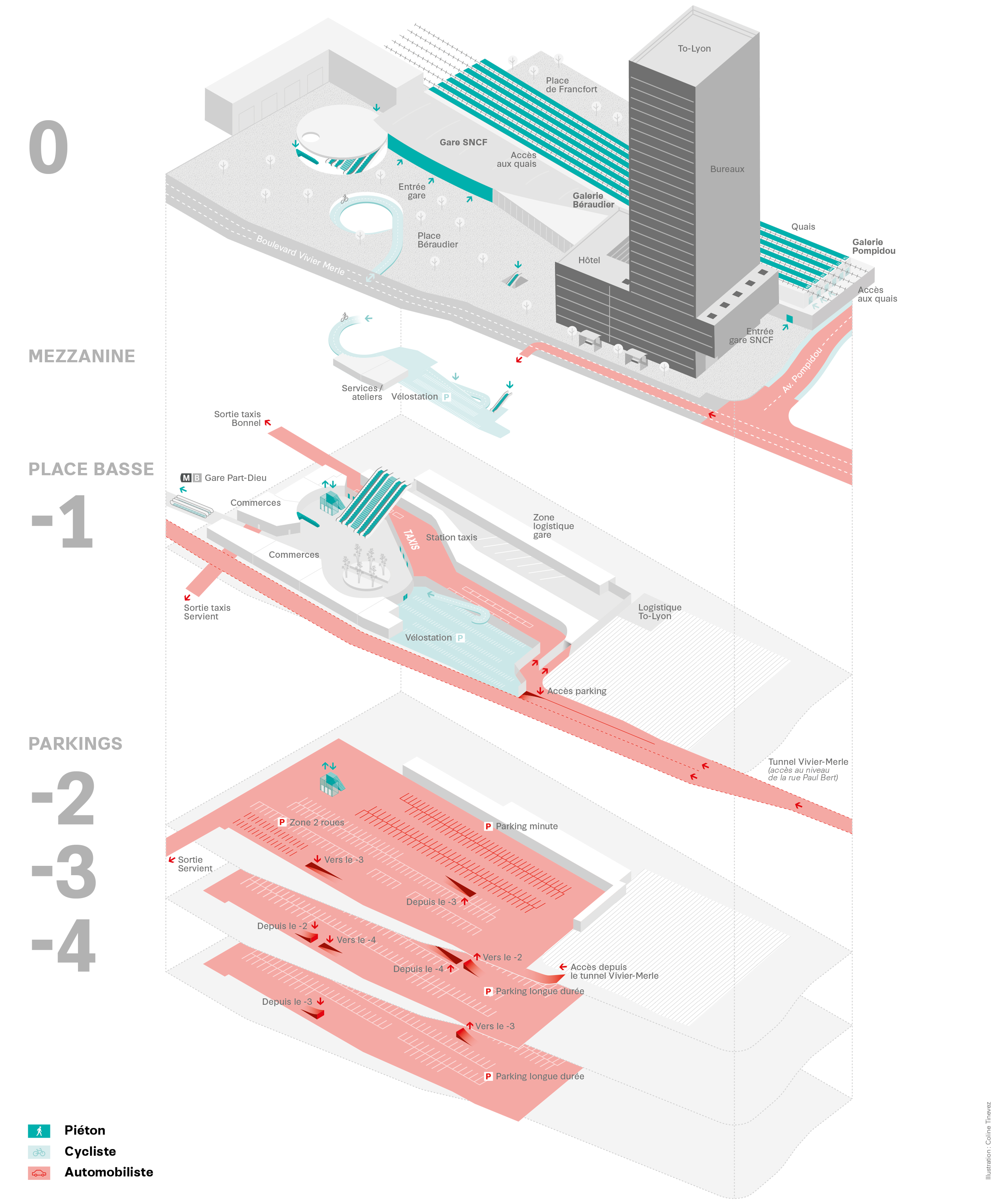 Au cœur du nouveau Pôle d’échanges multimodal (PEM), ces deux liaisons permettent de structurer les déplacements et les fonctions multimodales de la nouvelle gare Lyon Part-Dieu en lien avec le nouveau parking et place basse Béraudier, tout en libérant l’espace public en surface pour les modes actifs et transports en commun.