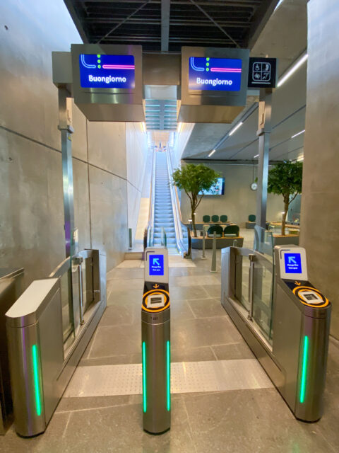 Grâce à la création de plancher de verre dépoli sur chaque quai, la galerie Pompidou bénéficie d’un éclairage naturel qui atténue l’impression de passage souterrain. La paroi vitrée qui longe l’ensemble de la galerie l’ouvre sur un extérieur apaisé pour une sensation d’espace encore plus importante.