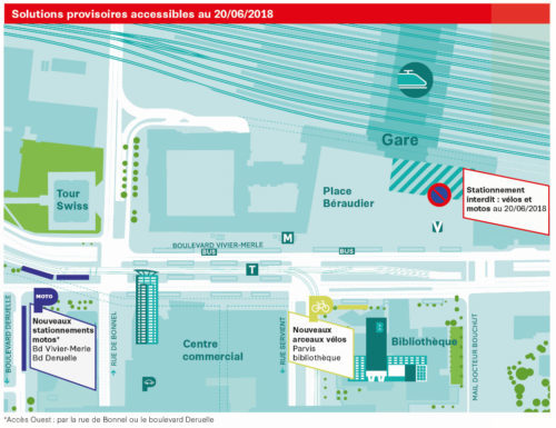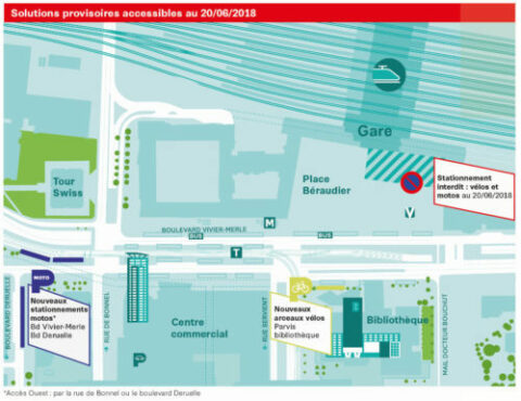 En raison de l’emprise chantier liée aux démolitions, le stationnement est interdit aux deux-roues motorisées et aux vélos sur la partie sud de la place Béraudier à compter de mercredi 20 juin 2018. Des solutions provisoires sont mises en place :