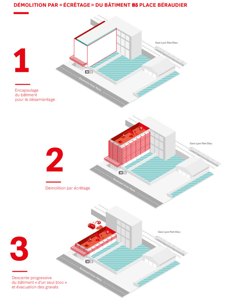 Dans le cadre du projet de réaménagement du pôle d’échanges multimodal, la SPL Lyon Part-Dieu lance les travaux de démolition de l’immeuble B5 (ex-immeuble du bailleur Dynacité) situé au nord de la place Béraudier. Cette démolition répond à deux objectifs: