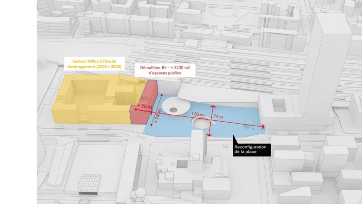 - A court terme d’ici 2022 : libérer l’emplacement de l’immeuble actuel pour rebasculer l’entrée de la gare de la Part-Dieu au nord de la place et poursuivre les travaux du parking Béraudier et de la place basse à l’emplacement actuel de la passerelle d’accès à la gare.