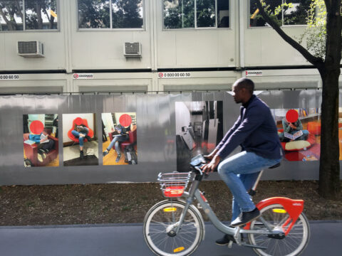 Les cyclistes et passants de la rue Bouchut peuvent découvrir depuis le 24 septembre une nouvelle série de photographies sur la palissade de la base-vie de chantier. L’exposition Lecteurs et séjourneurs présente le travail de Jacqueline Salmon, photographe en résidence à la Bibliothèque municipale de la Part-Dieu, dans le cadre des travaux de rénovation du silo. Centrée sur les postures de lecteurs et d’usagers de la Bibliothèque, elle fait écho à l’exposition “Totem et racine” située dans la bibliothèque.