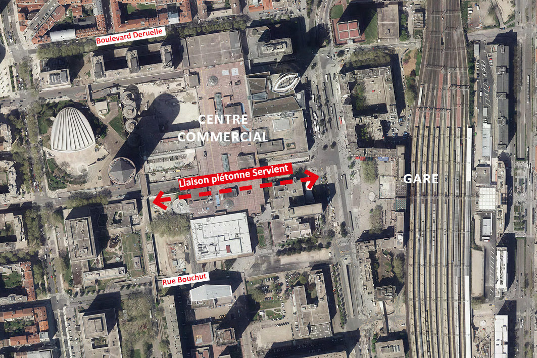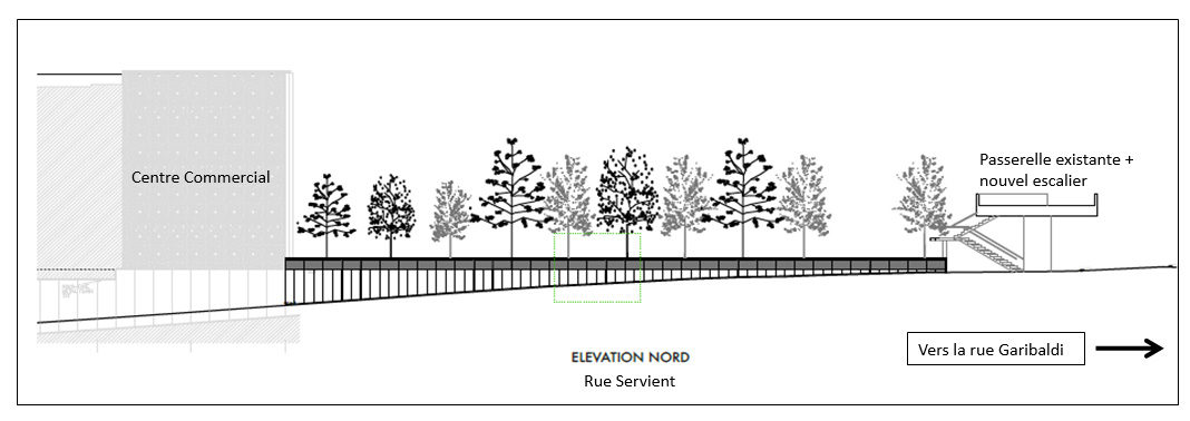 Le mail Servient donnera aux piétons la possibilité de rejoindre plus directement la gare depuis la rue Garibaldi, de manière sécurisée et accessible, en restant au niveau du sol : une amélioration notable compte tenu des multiples usagers passant actuellement dans la trémie de la rue Servient, malgré l’interdiction.
