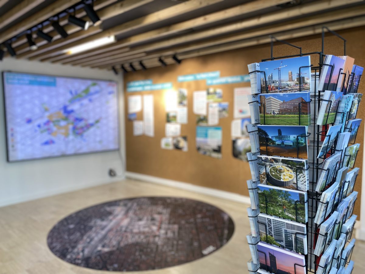 Les architectes ont imaginé la maison du projet comme un lieu chaleureux avec son plafond en mélèze et sa banque d’accueil et ses murs parés de liège, matériaux naturels, isolants qui correspondent à la nouvelle orientation du projet. Une nouvelle mise en lumière met en valeur les murs d’exposition et les maquettes.