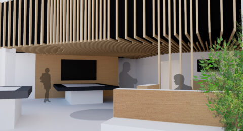 Qui dit nouveau lieu, dit nouvelle scénographie. Les architectes associés de l’Atelier MV, Bruno Vuilmet et Elise Mathé ont accompagné la SPL pour imaginer la nouvelle maison du projet. Leur projet transforme l’ancien hall d’accueil de l’immeuble en une maison des projets sur deux niveaux : l’accueil et l’exposition au rez-de-chaussée et une salle de présentation pour les groupes ou les activités de médiation en mezzanine, reliés par un nouvel escalier. Une structure composée d’un faux plafond et de lattes de bois fait le lien entre les 2 volumes.