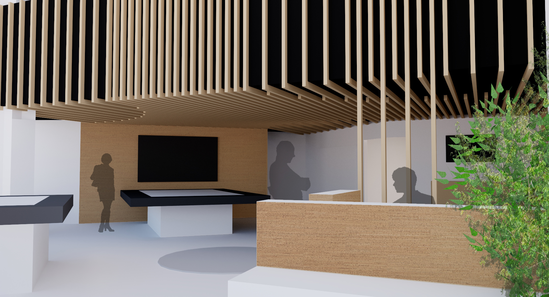 Les architectes ont imaginé la maison du projet comme un lieu chaleureux avec son plafond en mélèze et sa banque d’accueil et ses murs parés de liège, matériaux naturels, isolants qui correspondent à la nouvelle orientation du projet. Une nouvelle mise en lumière met en valeur les murs d’exposition et les maquettes.