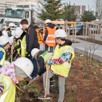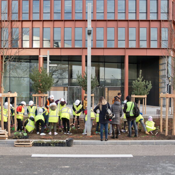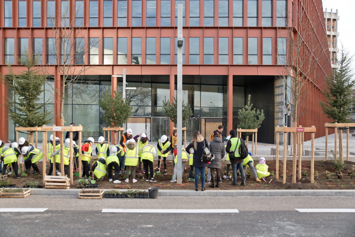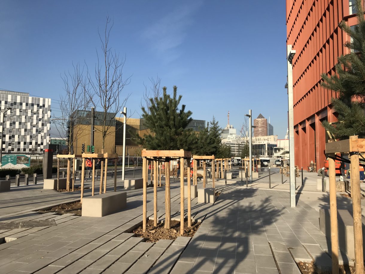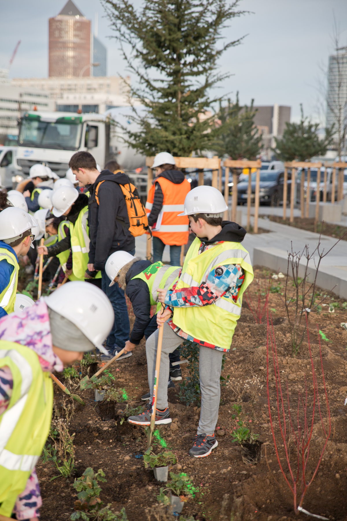 Pour plus de confort thermique et pour améliorer la qualité paysagère, près de 50 arbres ont été plantés en accord avec la palette paysagère du projet Lyon Part-Dieu : ginkgo, cèdre, poirier et févier d’Amérique. Des pins complètent les plantations en rappelant le lien avec la future extension de l’esplanade Mandela qui verra le jour entre l’immeuble Orange et les Archives départementales et métropolitaines à horizon 2024. Les plantations ont fait l’objet d’ateliers pédagogiques avec les élèves de l’école Nove-Josserand.