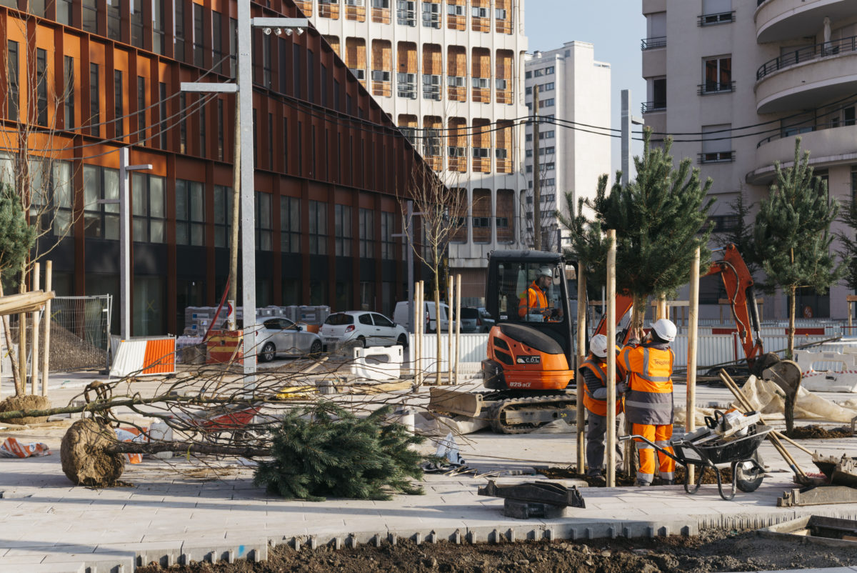 Un parvis piéton de 3000 m2 à l’angle de la rue Kimmerling vient remplacer un ancien parking désaffecté, permettant l’installation de nombreux bancs, la plantation d’arbres et de bandes végétales au sol. Des matériaux de couleur claire ont été choisis pour ne générer le moins de chaleur possible. Des joints perméables permettent d’irriguer directement les fosses des arbres.