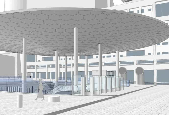 La face inférieure de l’auvent, convexe, est recouverte de cassettes en inox afin de créer une réflexion lumineuse légèrement troublée et refléter l’animation entre les 2 niveaux de la place. La composition de cette face a été pensée selon le principe de la géode.Un percement circulaire rompt la géométrie de l’objet et lui donne plus de légèreté tout en apportant de la lumière. Ce percement est couvert par une verrière qui protège les piétons de la pluie. Le chantier de l’auvent se poursuivra jusqu’à l’été.