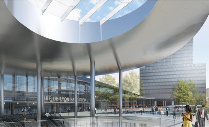 La face inférieure de l’auvent, convexe, est recouverte de cassettes en inox afin de créer une réflexion lumineuse légèrement troublée et refléter l’animation entre les 2 niveaux de la place. La composition de cette face a été pensée selon le principe de la géode.Un percement circulaire rompt la géométrie de l’objet et lui donne plus de légèreté tout en apportant de la lumière. Ce percement est couvert par une verrière qui protège les piétons de la pluie. Le chantier de l’auvent se poursuivra jusqu’à l’été.
