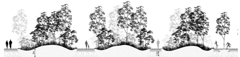 Côté végétation, on compte aujourd’hui 62 arbres et plus de 1000 plants d’arbustes, vivaces et graminées. A l’échelle totale du projet final, ce seront 1400 m² d’espace public réaménagés et 84 arbres plantés. Parmi les essences retenues pour ce projet, on retrouve notamment : des érables champêtre, des chênes chevelus, des tilleuls à petites feuilles pour les arbres, des hortensias ‘Hanabi’, des troènes ou encore des euphorbe des bois pour les strates basses.