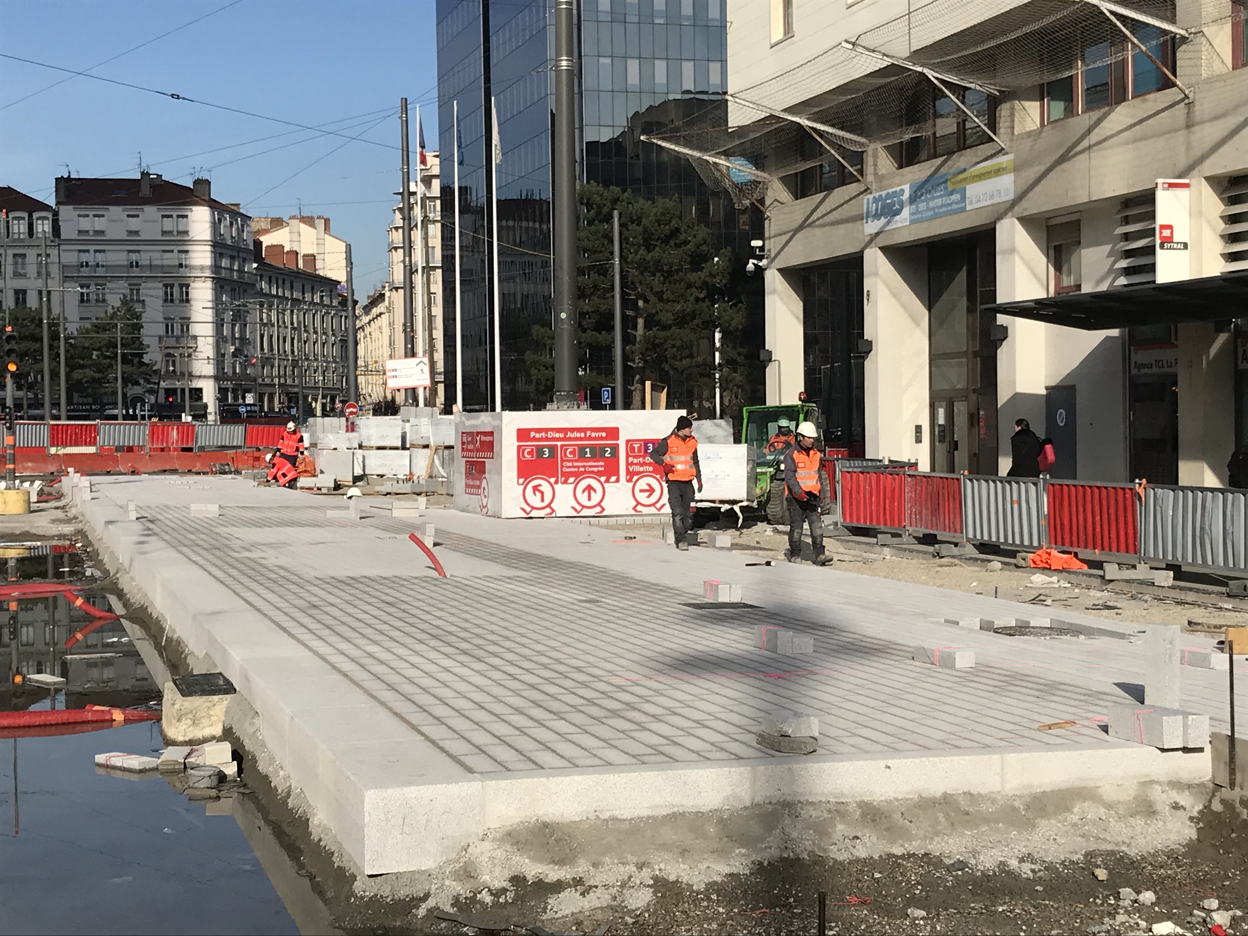 - Sur le secteur nord (pôle bus TCL) : les travaux de dallage et de coulage des chaussées s’achèvent devant l’agence TCL. Les travaux vont se décaler vers la gare, d’ici l’été.