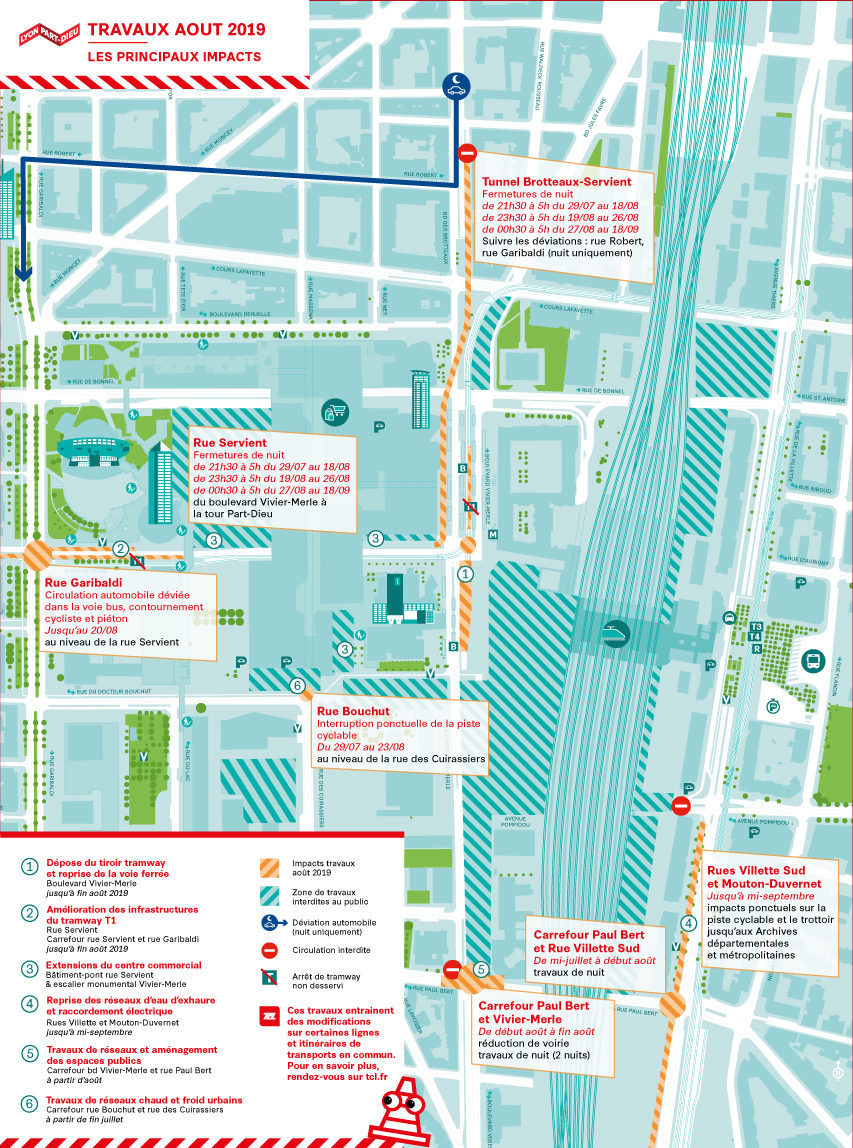 Pour les besoins du chantier du Sytral sur les infrastructures du tramway, le trottoir et la piste cyclable sont temporairement coupés au niveau de la traversée avec la rue Servient. Un contournement est mis en place pour les piétons et les cyclistes vers le trottoir Ouest, jusqu’au 20 août.