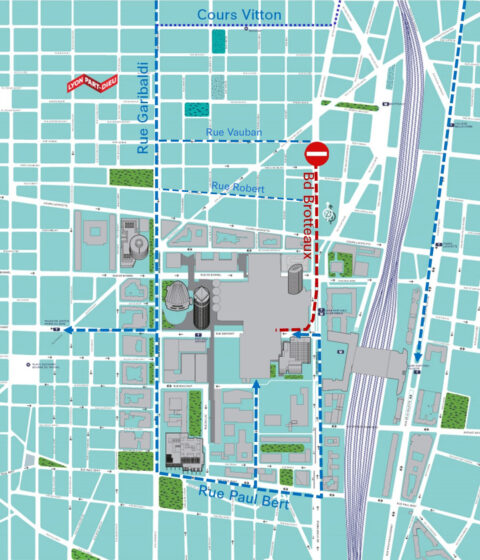 Depuis les Brotteaux, une déviation Nord-Sud est mise en place. - Rue Servient : le tourne-à-gauche depuis le boulevard Vivier-Merle est maintenu pendant les travaux (une seule voie de circulation).