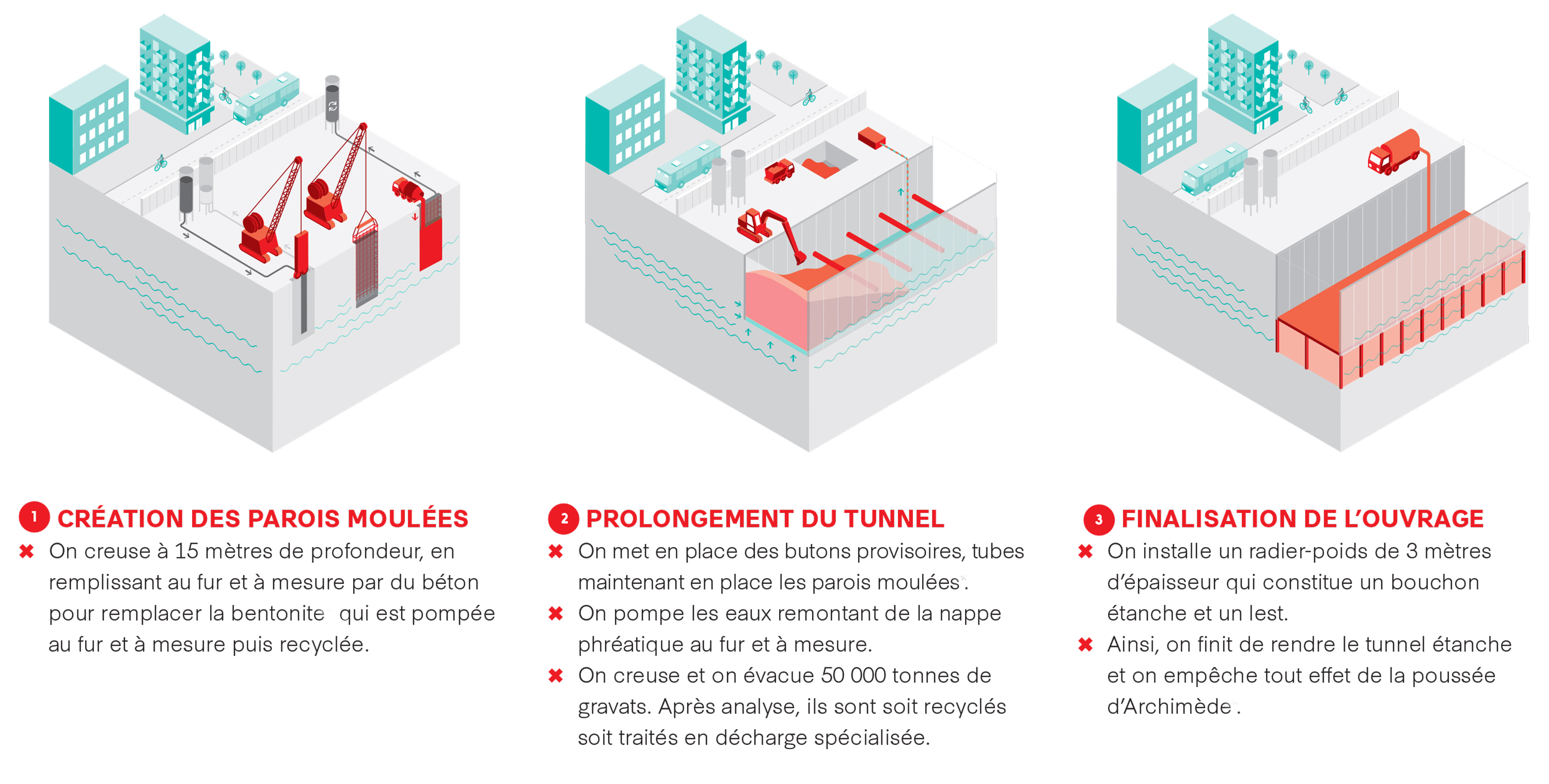 • de début octobre à janvier 2019 : réalisation des parois moulées au sud et modification de la sortie du tunnel au nord, vers le cours Lafayette