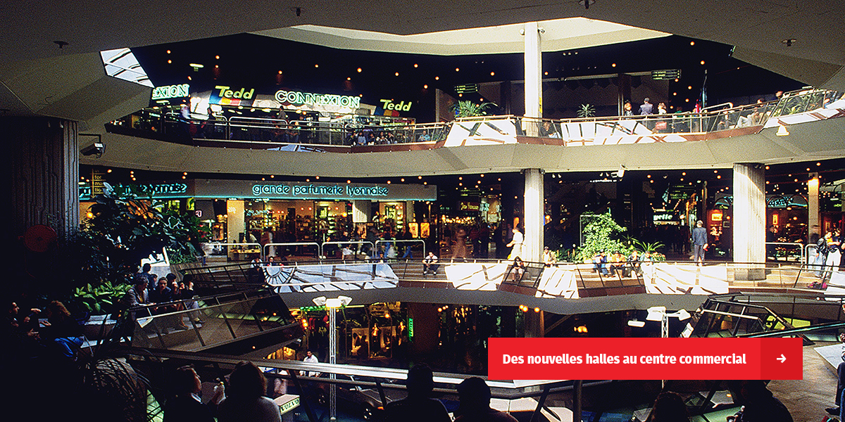 Avec l’installation des nouvelles halles de Lyon sur le Cours Lafayette en 1971 et l’ouverture du centre commercial en 1975, les lyonnais découvrent le shopping moderne à la Part-Dieu dans les années 70