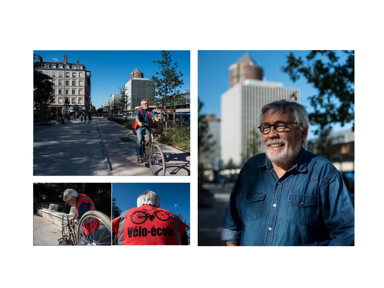 La maison du Vélo s’est installée aux 244 rue Garibaldi, pile en face de la piscine, il y a seulement quelques mois : la peinture des nouveaux locaux est encore fraîche et Gérard en a encore sur les mains. Il est bénévole à l’association depuis 2012, il venait alors d’arriver à Lyon. Plus qu’un moyen de transport, le vélo est pour lui une philosophie de vie qui permet de s’affranchir de la technique et de porter un autre regard sur le monde : « Lao Tseu dit « un voyage de mille lieues commence toujours par un premier pas », je pense que le premier coup de pédale permet de voir le monde autrement. » Il sait de quoi il parle, chaque année il fait une grande randonnée… de 700 kilomètres. Moniteur de la vélo-école, il a concocté des circuits avec une progression dans la longueur et la difficulté pour s’adapter aux besoins de l’élève… C’est dire s’il connaît les pistes cyclables de Lyon – il apprécie particulièrement l’aménagement cyclable de la rue Garibaldi, séparé du reste de la circulation sur le côté droit. Il a cependant une remarque, il faudrait en améliorer la signalisation. D’après lui, les lyonnais ne sont pas encore tout à fait habitués à partager la chaussée : les piétons marchent sur la piste comme si c’était un trottoir, les conducteurs oublient qu’ils partagent la chaussée avec les cyclistes, et ceux-ci roulent parfois trop vite… »