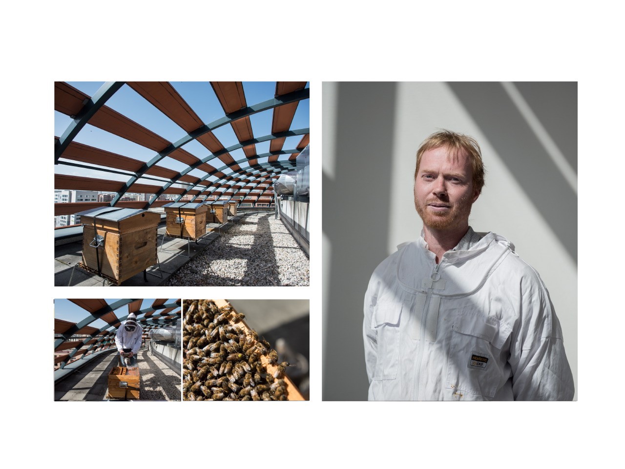 Apiculteur qui monte dans les tours, entrepreneur aux projets pleins de douceur : voici Lorris, fondateur de Graine d’abeilles. Une entreprise axée sur deux volets : l’apiculture classique en campagne, avec élevage des abeilles et production de miel, et l’apiculture urbaine, avec installation des ruches en ville au sol ou sur des toitures d’entreprise. En l’occurrence, tout en haut de l’immeuble Terra Mundi, pour le compte du bailleur social Grand Lyon Habitat. Depuis trois ans, Lorris a posé quatre ruches, c’est-à-dire, quelque 240 000 abeilles. « Mais seulement une partie de la colonie part butiner, explique-t-il, les autres restent à la ruche pour réaliser les différents travaux d’entretien de la colonie et pour soigner la progéniture. »