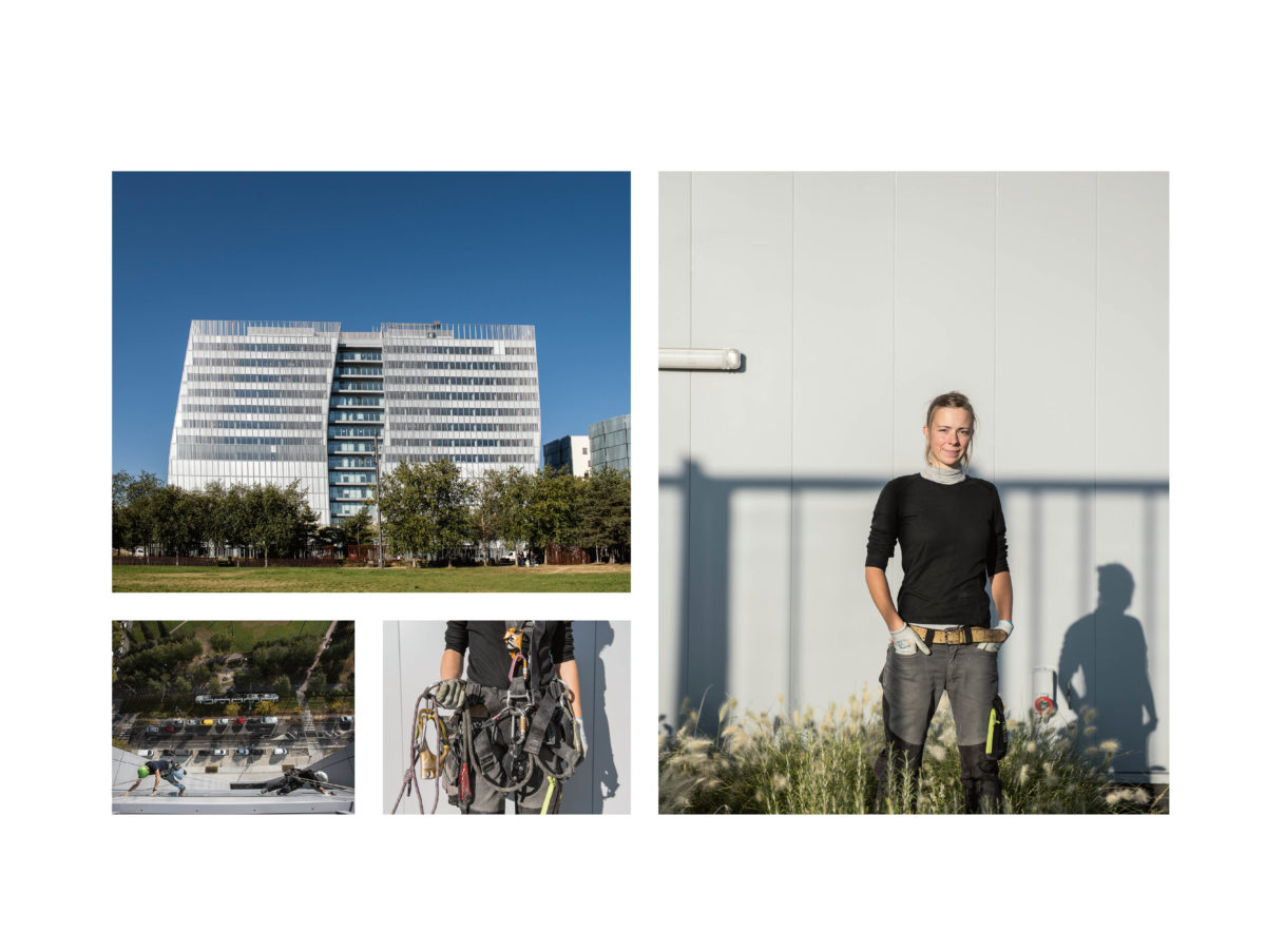 Marie-Laure travaille depuis quatre ans chez Everest, un spécialiste de travaux d’accès difficile et de hauteur. On l’a rencontrée avec Matthieu, son binôme, au sommet du rooftop de Sky 56 et on avait le souffle doublement coupé : d’un côté, la vue imprenable sur Lyon, de l’autre, ces deux voltigeurs du bâtiment, suspendus au-dessus du vide au flanc des étonnantes façades incurvées. La fin du chantier approche et ils s’occupent du nettoyage et de la remise en état pour que le bâtiment soit « tout étincelant » au moment de son inauguration.