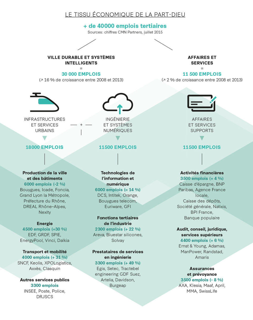 For a long time the site was thought of as a traditional business district, with a strong presence of banks and high added value services. Today, La Part-Dieu showcases a more unusual angle of services resulting from the emergence of activities connected with the sustainable city and smart systems. With 30,000 jobs and +16% growth between 2008 and 2013, these activities are now an essential part of the economic landscape.