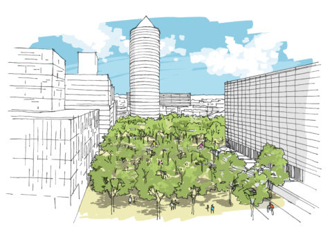 L’extension de la place vers le nord, entre la rue Bouchut et la rue Servient, constituera le lien entre la tour Part-Dieu et l’hôtel de Métropole. En cohérence avec les principes de frugalité et de sobriété, l’espace sera végétalisé et équipé pour en faire un lieu apaisé pour les habitants du quartier ou les salariés à proximité. En accord avec les socles actifs des bâtiments alentours du mobilier urbain adapté aux usages sera installé. Les 7 800m² supplémentaires d’espaces publics contribueront à créer une continuité végétale entre la place et le bois de la Part-Dieu. Pour permettre la réalisation des plantations, un travail de reconstitution des sols sera entrepris en amont, en lieu et place du bâti existant.