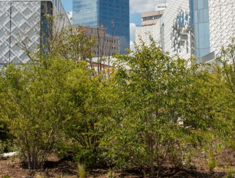Ce sont plus de 2 000 tonnes de substrat qui ont été disposées sur le toit pour accueillir ces îlots végétalisés. Composé de terre végétale, de compost et d’éléments drainants permettant d’évacuer l’eau de pluie en surplus, le substrat répond parfaitement aux besoins en nutriments des plantes et arbres. Le défi à relever était notamment le poids de l’installation : il a fallu alléger au maximum cet ensemble, tout en générant des réserves d’eau disponibles pour les végétaux. Cela a été possible notamment grâce à l’apport de billes d’argile, de pouzzolane, de compost, de fibre de coco… Sur le bâtiment existant, les massifs paysagers ont été plantés dans une épaisseur de substrat d’environ 30 cm, limitée par la capacité de la structure existante à supporter un tel poids. En effet, 1 m3 de substrat ne pèse pas loin de 900 kg.