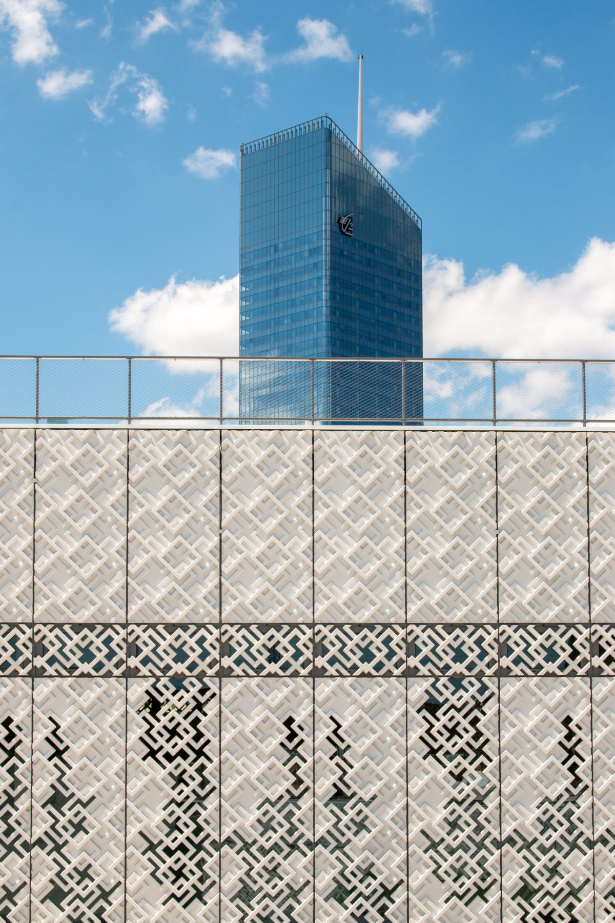 Afin d’offrir une pause « verte » au cœur du quartier d’affaires de la Part-Dieu et pour lutter contre le ruissellement des eaux de pluie, une promenade et des jardins de 7 000 m² ont émergé sur le toit terrasse imaginés comme un véritable parc urbain par l’agence de paysagiste Base.
