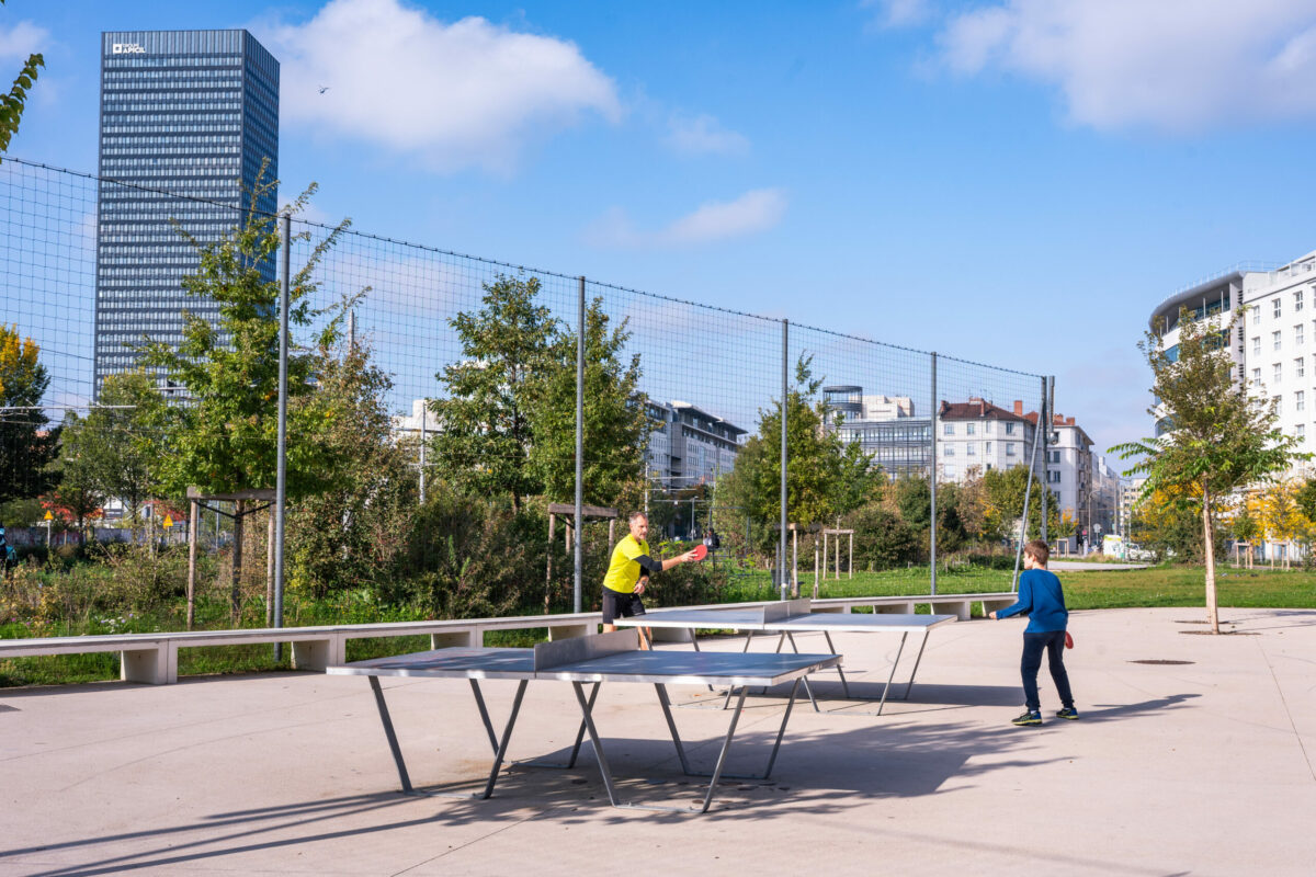 - Un parc sportif de 1 500 m² comprenant: 2 tables de ping-pong, un terrain multisports avec 2 paniers de basket adaptés à des pratiques pour les plus jeunes et une aire de glisse destinée principalement aux enfants avec des pentes très douces