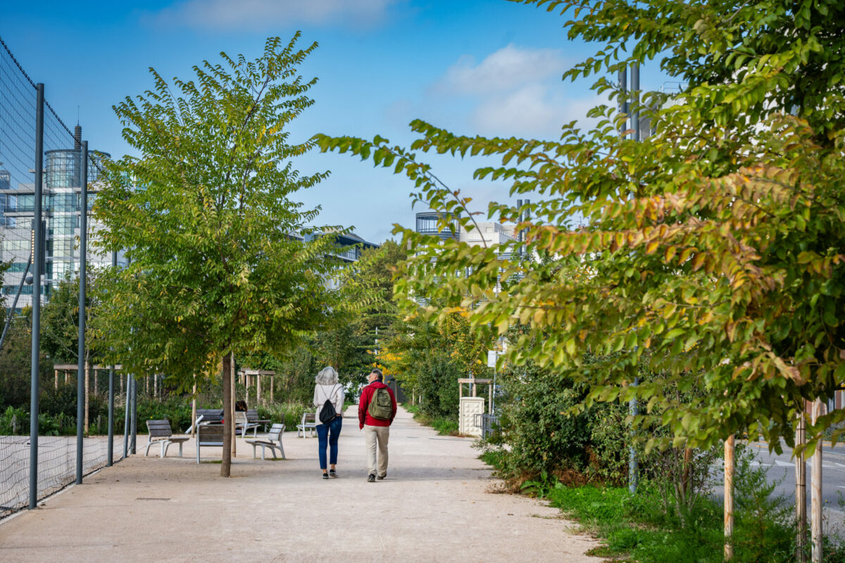 - De nouvelles lisières végétales plantées de manière généreuse et composées de trois strates végétales. Une centaine d’arbres ont été plantés dont 55 de manière anticipée dans le cadre de la préfiguration végétale conduite à l’hiver 2022, dont les principales essences sont : le tilleul à petite feuilles (tilia cordata), l’orme de Chine (ulmus parviflora), le chêne rouvre (quercus petreae)