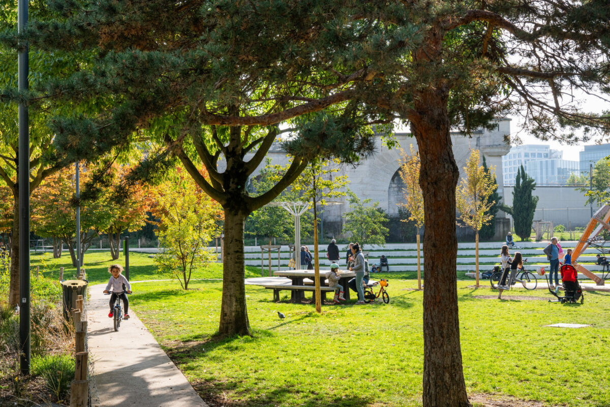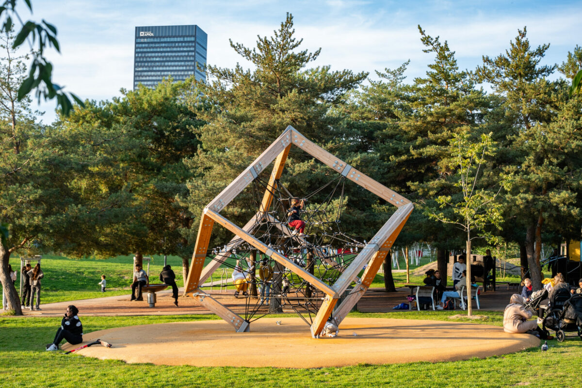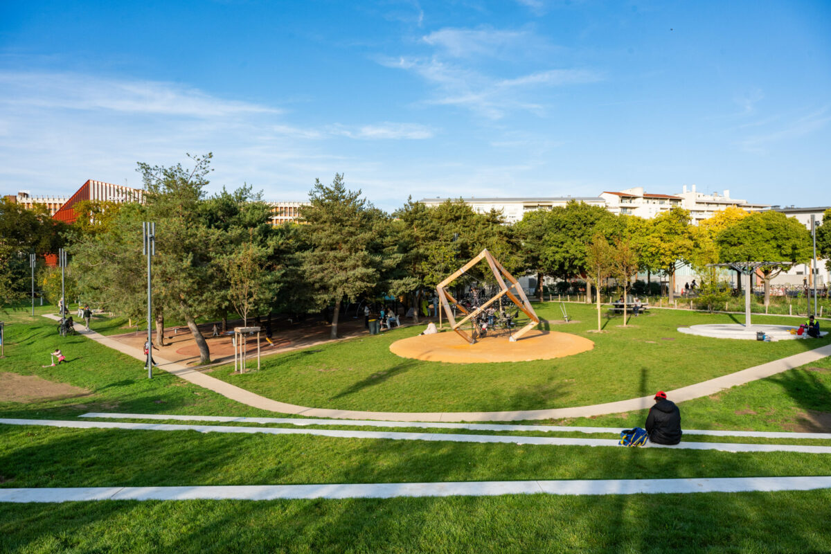- L’aire de jeux existante requalifiée et agrandie: le sol souple a été conservé mais lavé et rafraîchi. De nouveaux jeux ont été installés au sein d’une zone enherbée : création d’une piste de vélo d’apprentissage pour les enfants, installation d’une balançoire nid, d’un trampoline, d’une toupie et d’un nouveau jeu de cordage. Des modelés de terre apportent davantage de relief et favorisent la motricité. L’arbre à pluie a été transformé en arbre à brume.