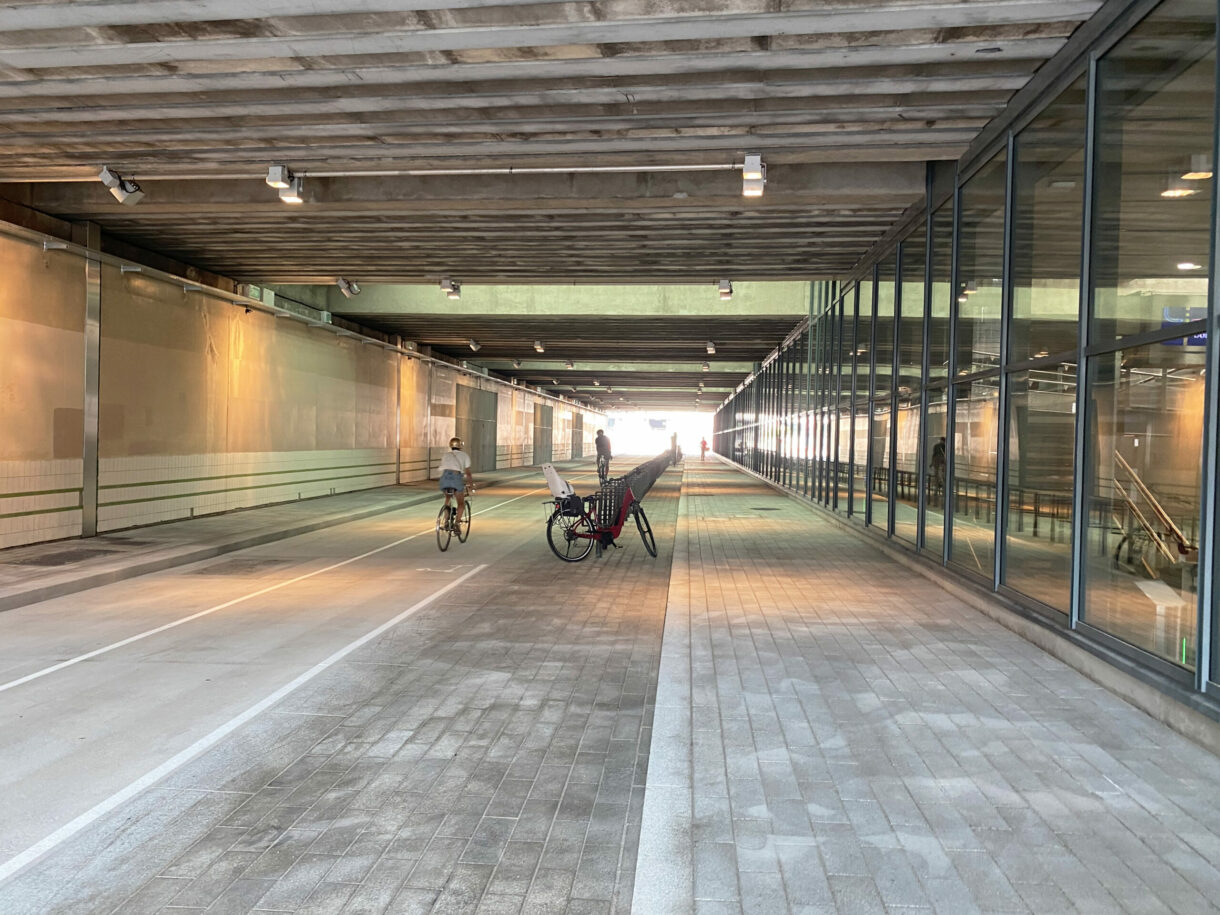 - 2 trottoirs confortables pour les piétons sous le tunnel (2,80 m au nord hors emprise arceaux vélos, 2 m au sud)