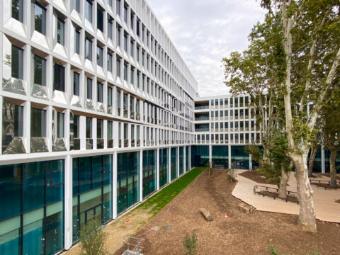 Une place importante est également attribuée à la végétalisation : conservation des platanes historiques de l’ancienne caserne, vaste jardin arboré et terrasses qui offrent plus de 3 000 m² d’espaces extérieurs.