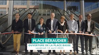 Le réaménagement de la place Béraudier s’inscrit dans le projet plus vaste de reconfiguration du pôle d’échanges multimodal (PEM) Part-Dieu, autour du projet d’extension de la gare de la Part- Dieu, dont le chantier arrive à terme cette année après 12 ans d’études et de travaux. La nouvelle place Béraudier propose un parvis agréable et accueillant à la hauteur des besoins de la première gare de correspondance d’Europe. Agrandie (de 19 mètres vers l’ouest et 37 mètres vers le sud), la place Béraudier devient ainsi un vaste espace piéton, arboré et ouvert sur le quartier. Les autres fonctions d’intermodalité (vélostation, parking, accès métro) et la logistique s’organisent au niveau inférieur, celui d’une place basse généreusement éclairée par la lumière naturelle grâce au parti pris architectural de vastes ouvertures circulaires.