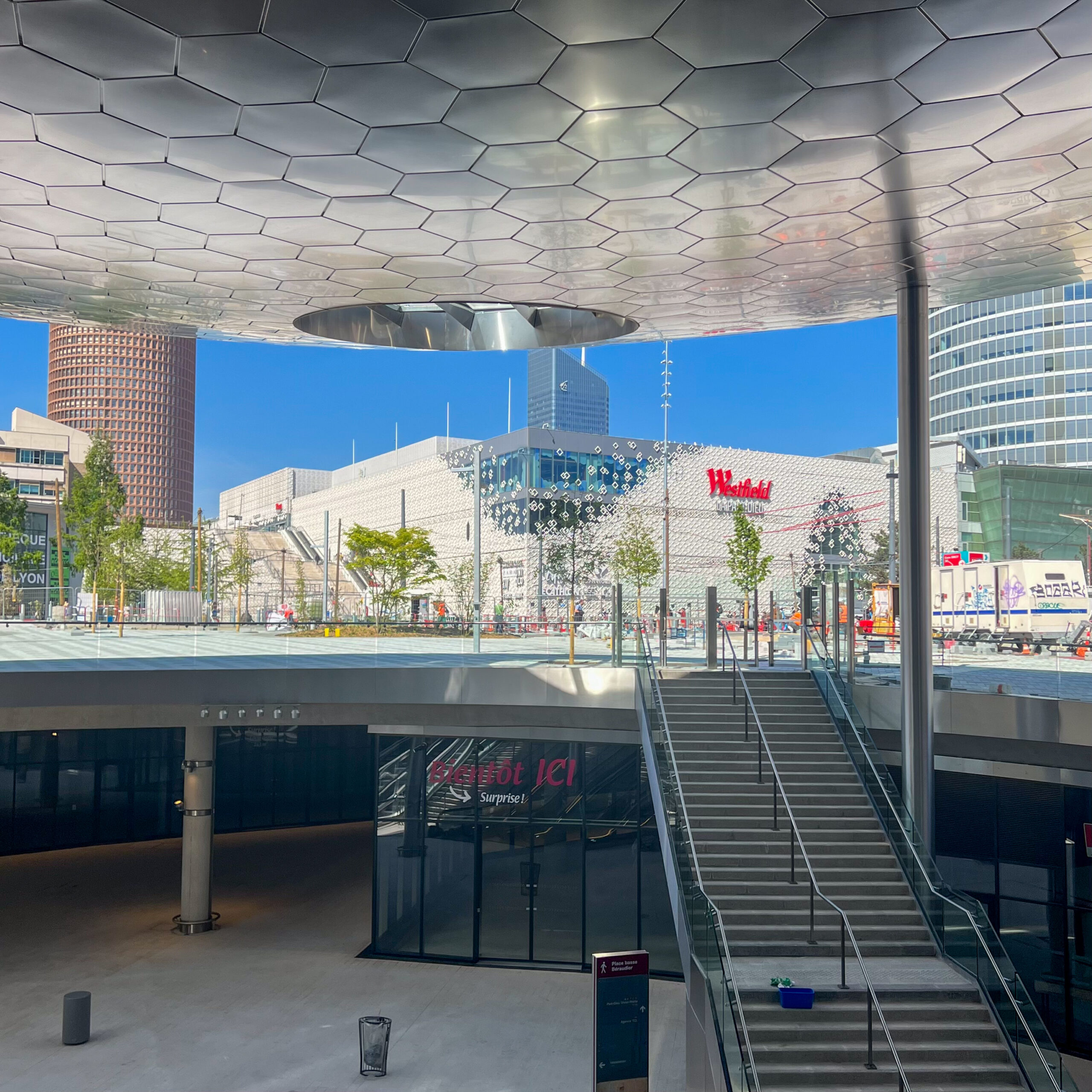 “L’auvent monumental de la place Béraudier constitue un marqueur fort de la transformation urbaine de la Part-Dieu. Conçu comme un ouvrage d’art et un nouveau signal urbain, il crée un lien fluide entre la ville, la gare et les différentes solutions de mobilités. Sa structure élancée permet une continuité visuelle avec les façades de la gare et les différentes perspectives urbaines environnantes. Sa sous-face inox, légèrement bombée, reflète l’animation entre les deux niveaux de la place, et instaure une ambiance sécurisante et dynamique.” Edouard Pernot (Sud Architectes)
