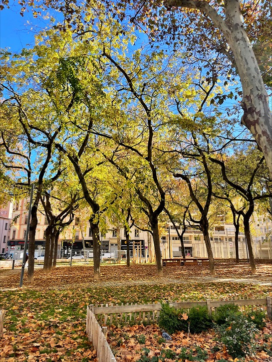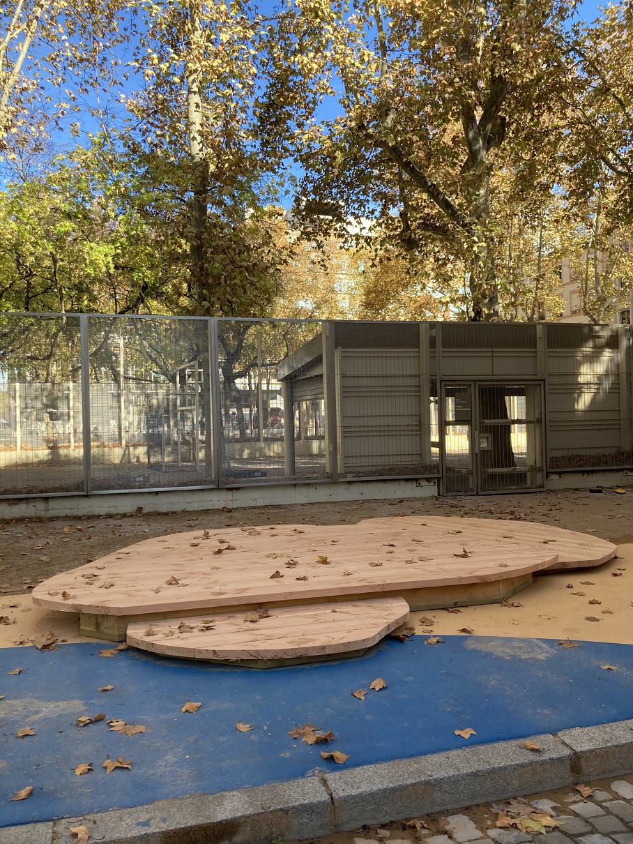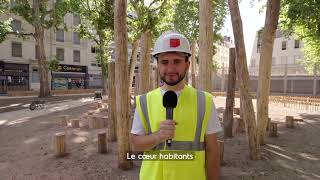 Lorsque cela a été possible, le projet a privilégié le réemploi de matériau. C’est le cas par exemple des anciennes bordures de la place, transformées en « pas japonais » pour faciliter l’accès aux pelouses ou encore les rondins de la structure ludique qui proviennent des platanes malades abattus en début de chantier.