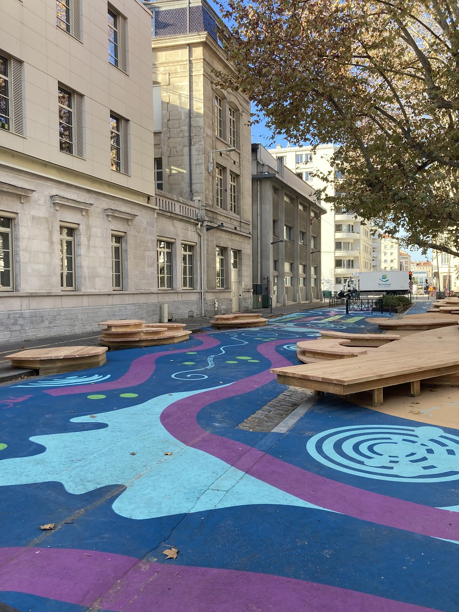 Un lieu de pause fortement végétalisé, préservé des flux avec du mobilier de détente et de loisir. On y retrouve notamment une structure de rondins en bois et une grande table de pique-nique sous un éclairage inspiré des guinguettes. - Le parvis ludique, entre l’école et sa cour déportée