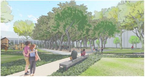 En plus de la végétation existante conservée, sept arbres supplémentaires ont été plantés, accompagnés de 1 087 arbustes et 6 000 vivaces, permettant de gagner 42 % de surfaces végétalisées sur l’ensemble du projet.